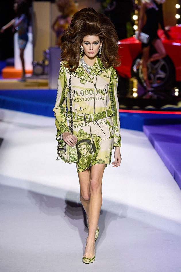 Tudo começa com Kaia Gerber usando um look de um milhão de dólares – não literalmente, mas com uma nota fictícia de um milhão estampada. Referências a cifrões e pedras preciosas convivem com uma nova versão das roupas estampadas de embalagens de produtos industrializados (a Moschino já lançou vestidos de festa com essa ideia e agora traz conjuntos tipo jogging e vestidos curtos). O cabelo é grandão, mas grandão mesmo, meio virada dos anos 60 pros 70; e o estilo é peruona sexy com dourado, drapeado, casaco de pele. No fim, aparece uma capa surreal enlouquecedora de marmita com bife, purê e seleta de legumes – só vendo a foto pra entender, mesmo… Essa capa deve ser disputado a tapa pro próximo baile do Met, cujo tema é camp. Quem será que vai usar?