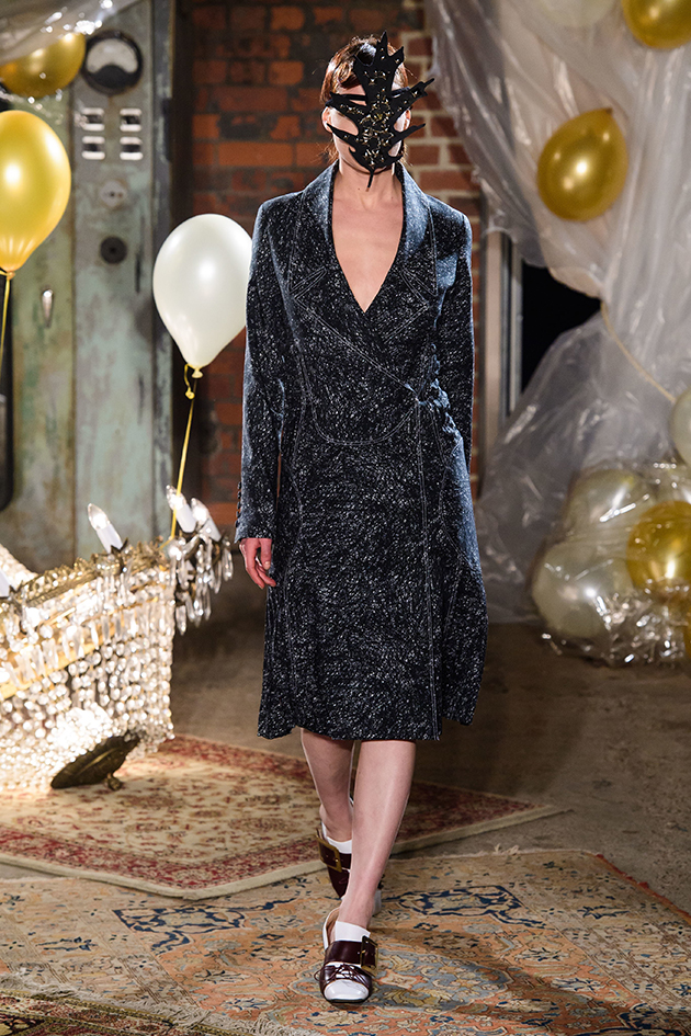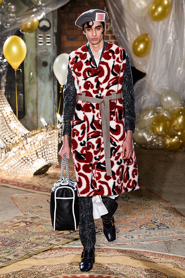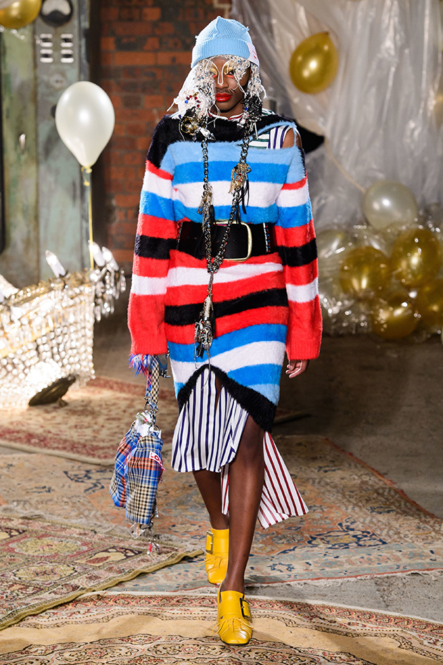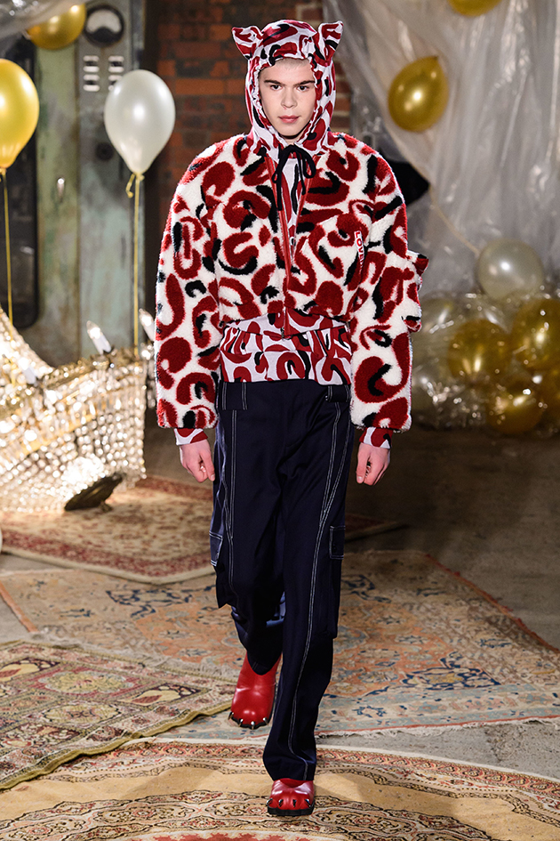 Os looks têm aspecto lúdico como se fossem roupas infantis usadas por adultos, numa alfaiataria de cores vibrantes com acessórios de contos mágicos como toucas com orelhinha, boinas ou penas. Para ambientar a coleção outono-inverno 2019/20, um cenário peculiar: lustres caídos, banheira ornamental cheia de páginas de livros arrancadas, uma pilha de colchões velhos, uma penteadeira enfeitada e bexigas metalizadas, num mix de móveis deixados no porão com estilo memorabilia. Na galeria você entra no clima da Terra do Nunca e confere os looks da coleção – é só clicar na foto!
