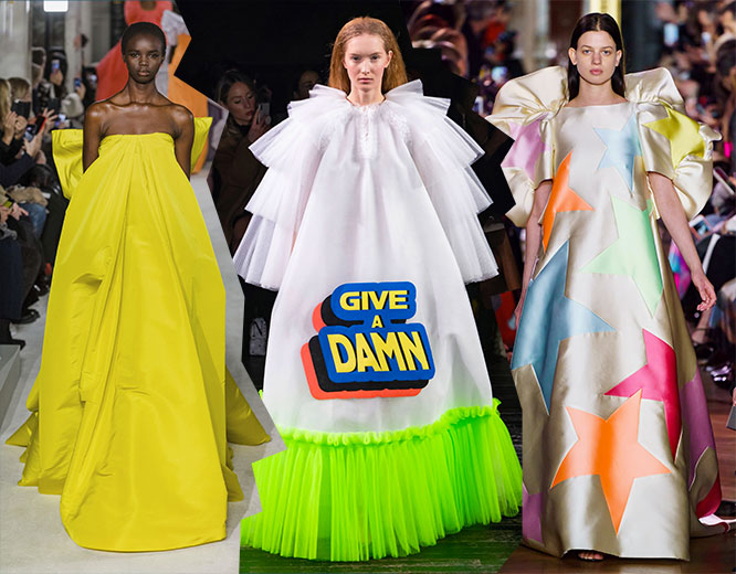 Na alta-costura de primavera-verão 2019 já teve bastante vestidão! Aqui na foto, da esq. pra dir., Valentino, Viktor & Rolf e Schiaparelli Tags: Ashish Balenciaga Carolina Herrera Delpozo Emilia Wickstead Erdem floral Giambattista Valli J.W Anderson Kaia Gerber Lady GaGa Marc Jacobs maxivestido moda festa Molly Goddard Moncler outono-inverno 2019/20 Pierpaolo Piccioli Richard Quinn Roberto Cavalli Rochas Roksanda Sabrina Sato Schiaparelli Tomo Koizumi Valentino vestidão vestido vestido paraquedas Viktor & Rolf Y/Project
